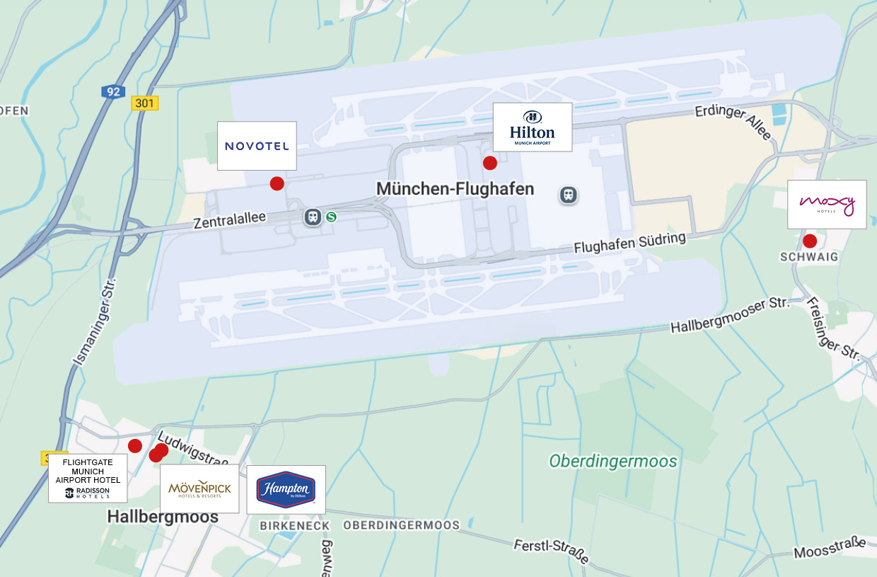 Quellenhinweise: Auf dieser Seite werden Fotos, Symbole / Logos von der Flughafen München GmbH, Deutsche Lufthansa AG sowie der Hotels Hilton Munich Airport, Hampton by Hilton Munich Airport South, Novotel Munich Airport, Flightgate Munich Airport Hotel, Mövenpick München Airport und Moxy Munich Airport, wiedergegeben und mit diesen Unternehmen und Hotels verlinkt.